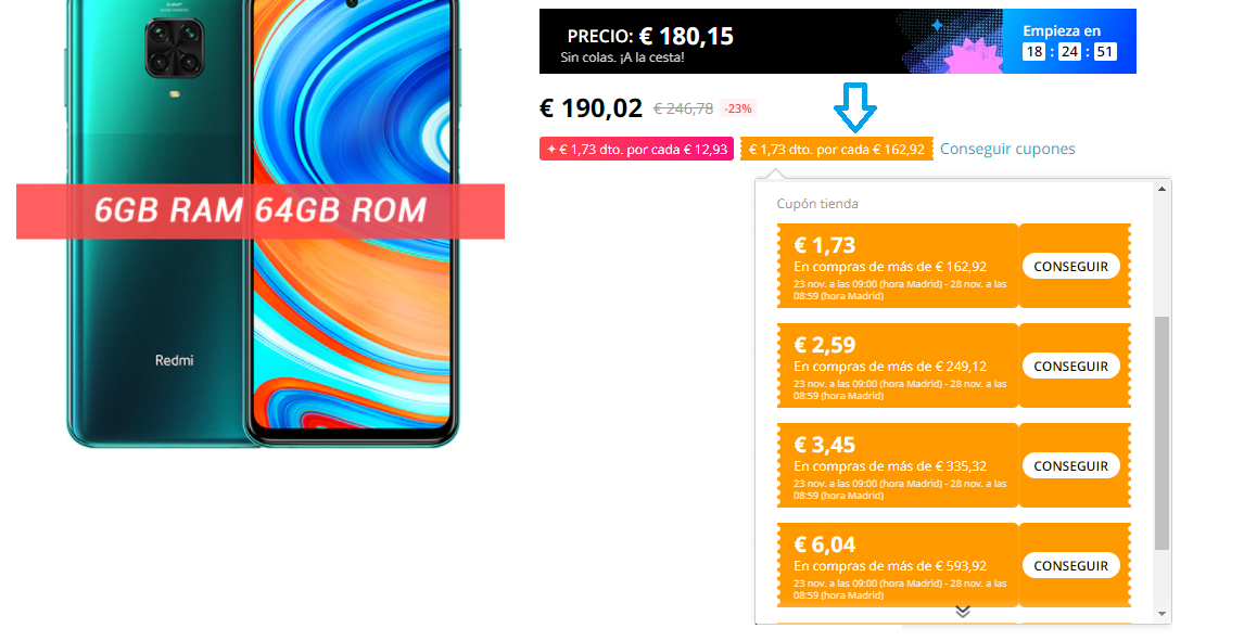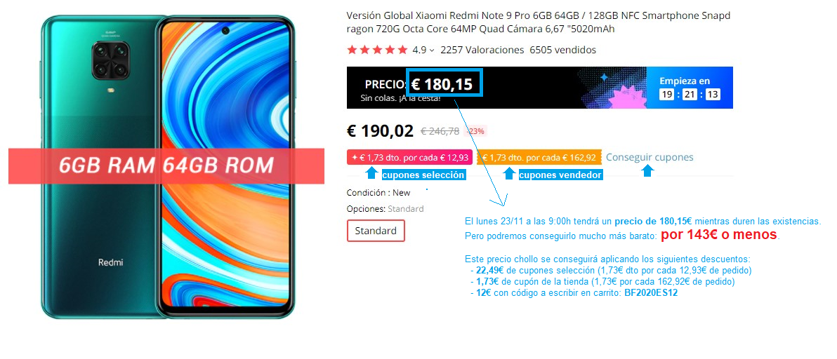 - Antes de que empiece la promo ya puedes ver los precios del Black Friday (que podrás reducir más con cupones y códigos) que tendrán muchos artículos. Importantísimo añadir los que te interese a carrito para "reservar" la oferta. Ejemplo práctico para el smartphone Redmi Note 9 PRO de 64GB que se podría conseguir por 143€ o menos.