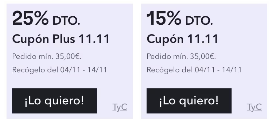 ➡️ Cupón 15%: 15% de descuento en compras mínimas de 35 €. Máximo descuento 8 €.