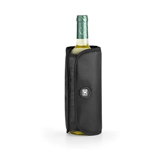 Funda enfriadora BRA, ideal para mantener tus botellas de vino o cava bien fresquitas. Está hecha de un tejido impermeable y cuenta con un ajuste elástico lateral que se adapta a diferentes tamaños. Es práctica, reutilizable y tiene un diseño elegante en color negro.