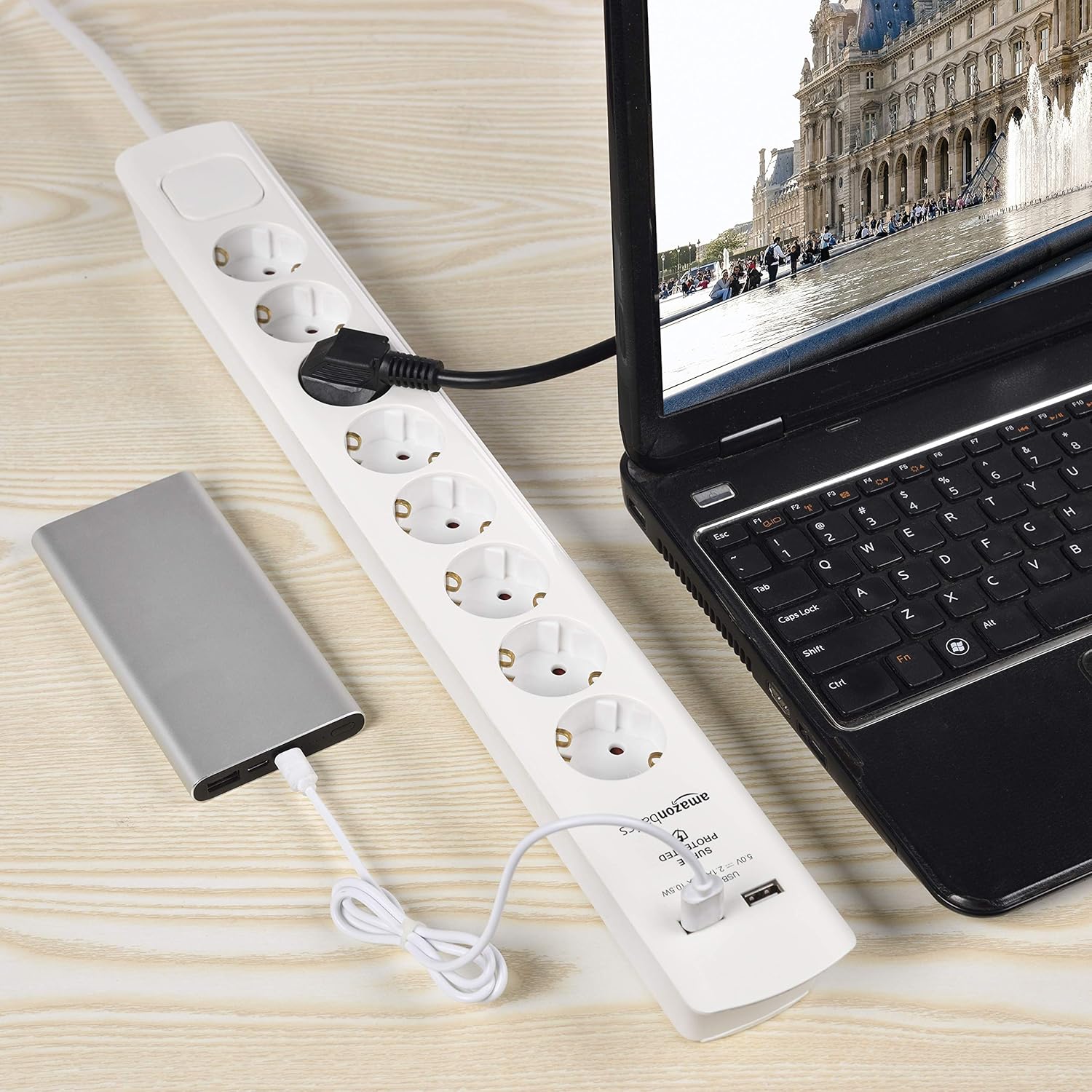 Regleta de 8 tomas con 2 salidas USB, protección contra subidas de tensión e interruptor de corriente, de 2 metros de longitud. Diseño redondeado, compacto y fino.